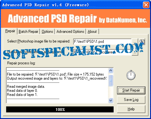 At SoftSpecialist you can see the GUI to know how the program Advanced PSD Repair will look like on the screen after you install it on your computer.