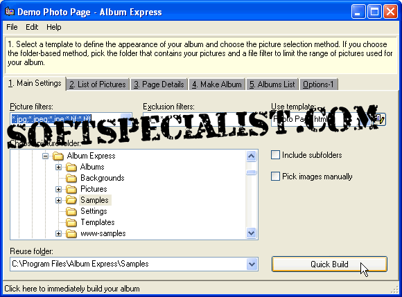 At SoftSpecialist you can see the GUI to know how the program Album Express will look like on the screen after you install it on your computer.