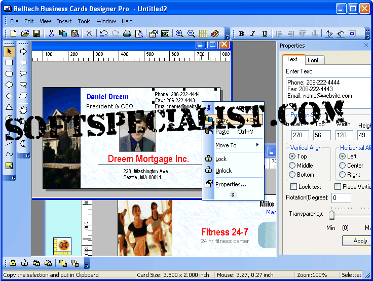 At SoftSpecialist you can see the GUI to know how the program Belltech Business Card Designer Pro will look like on the screen after you install it on your computer.