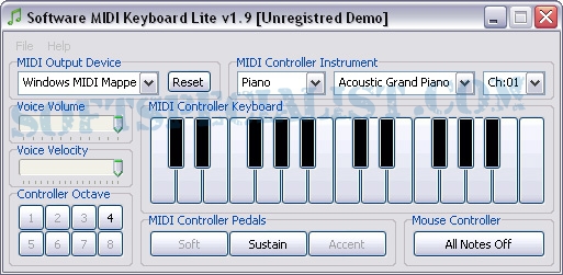 At SoftSpecialist you can see the GUI to know how the program Software MIDI Keyboard Lite will look like on the screen after you install it on your computer.